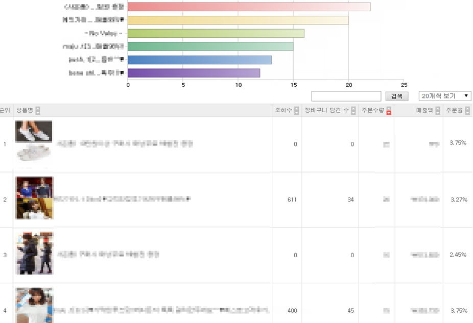 관심도가 높은 상품인데 주문율이 낮은 경우 이미지 보정, 가격조정, 상품평을 등을 통해 구매율을 높여 보세요.